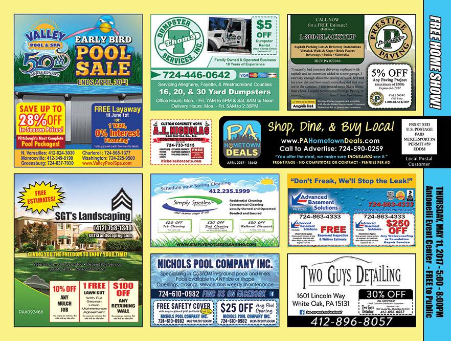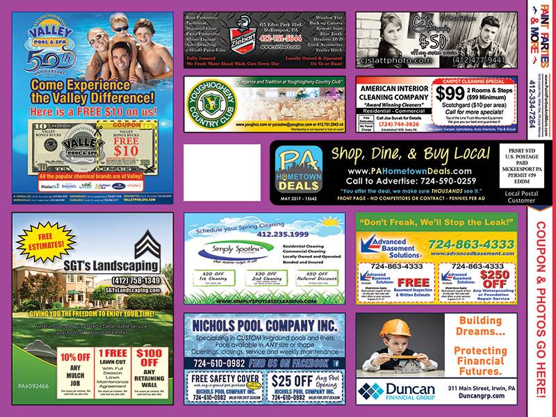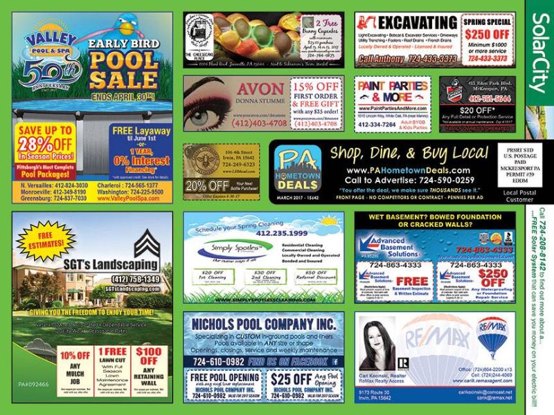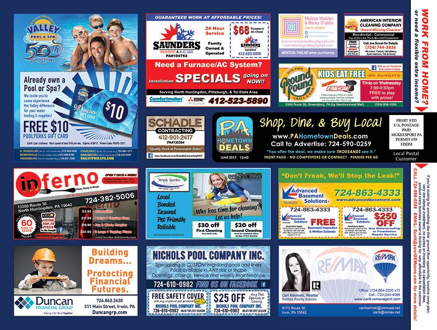 We just mailed 20,000 postcards and distributed 10,000 flyers throughout the Route 30 corridor, saturating the entire area from North Versailles through Irwin down to Jeannette. These postcards are IMPOSSIBLE to miss so sign up today! Check out all the DEAL$ offered HERE!